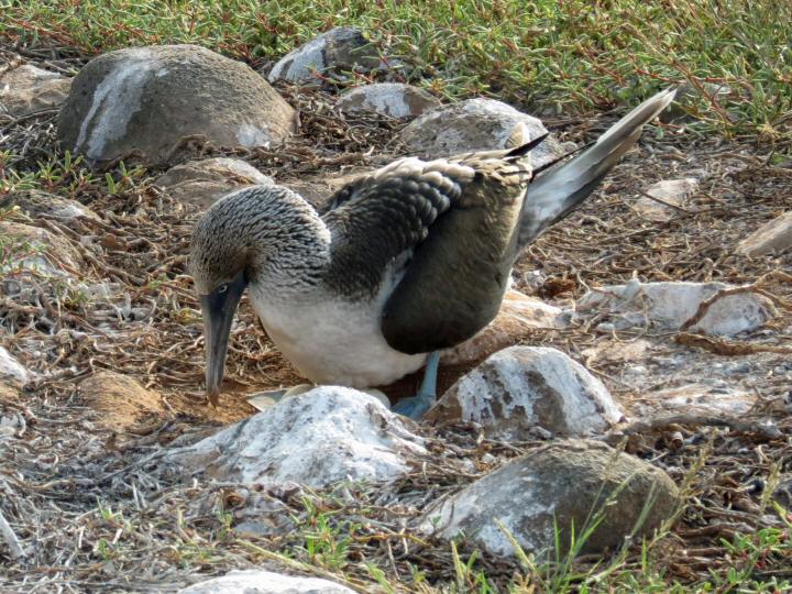 Blue-footed booby with eggs on North Seymour