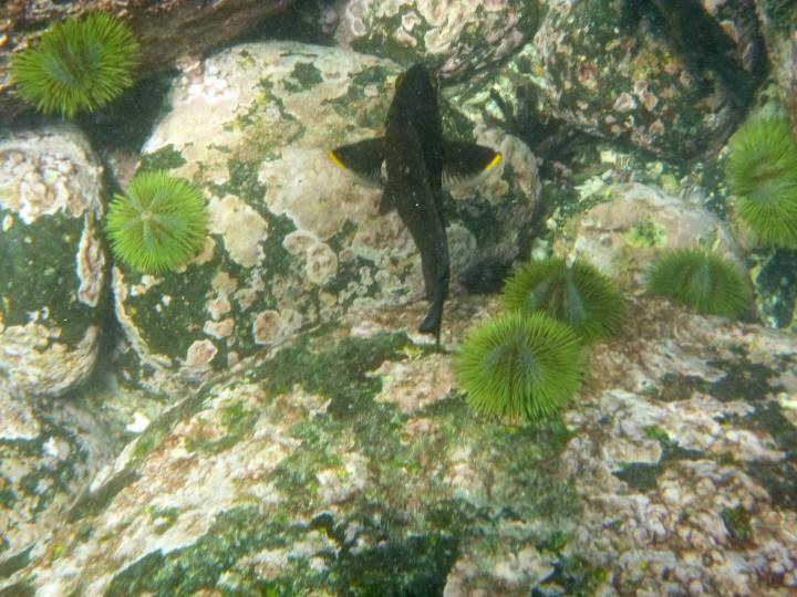 Sea urchins and White-tailed damsel fish in Urbina Bay, Isla Isabela