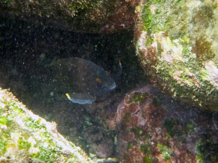 Lurking Whte-tailed damsel fish Urbina Bay, Isla Isabela